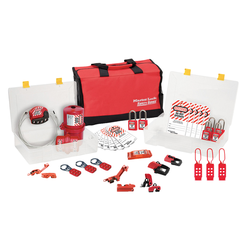 The Master Lock 1458E410PRE Premier Electrical Lockout Kit offers a complete selection of electrical lockout devices, including plastic padlocks, hasps, tags, and a premium assortment of tools, all stored in a soft-sided carrying case. Designed for portability and organization, the case features two clear storage compartments for quick access to essential lockout components, making it ideal for professionals performing electrical maintenance and lockout/tagout procedures.