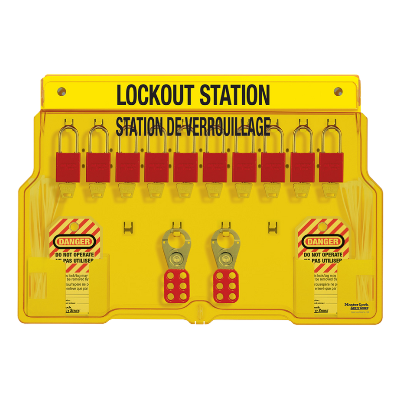 The Master Lock 1483BP1106FRC Wall Mounted Lockout Station is a bilingual (French/English) 10-lock padlock station designed for robust and organized lockout/tagout management. Constructed from resilient polycarbonate, it offers superior heat resistance and impact strength. A translucent, lockable cover protects equipment from dust and loss, while reinforced snap-on clips provide easy storage and removal. Its one-piece molded design ensures durability and eliminates loose parts, measuring 15-1/2″ high x 22″ wide x 1-3/4″ deep for ample storage space.