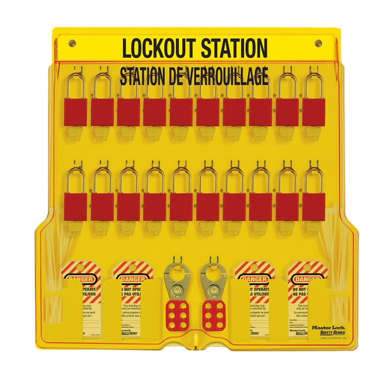 The Master Lock 1484BP1106FRC Wall Mounted Lockout Station is a durable French/English 20-lock station constructed from resilient polycarbonate for superior heat resistance and impact strength. It includes A1106RED aluminum padlocks and features a translucent, lockable cover to protect contents from dust and prevent missing equipment. Reinforced snap-on clips make padlock and hasp storage and removal easy, while the one-piece molded construction eliminates loose parts. Measuring 22″ high x 22″ wide x 1-3/4″ deep, this station offers ample space for organized and secure lockout/tagout management.