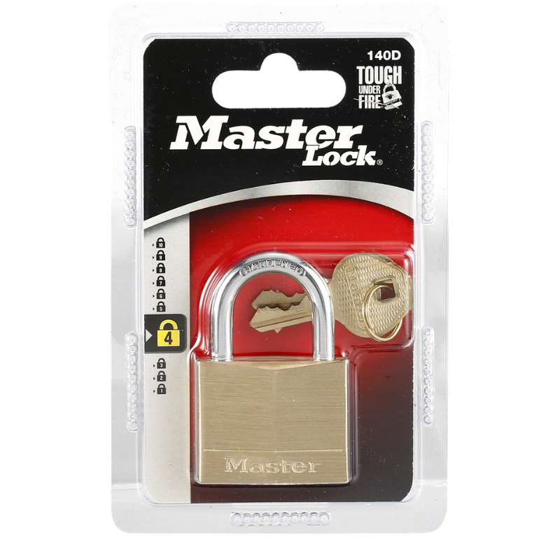 The Master Lock No. 140D Solid Brass Padlock combines strength, durability, and security in a compact design. Featuring a solid brass body for corrosion resistance and a hardened steel shackle for enhanced cut resistance, this padlock is built for reliable performance. The 4-pin cylinder and dual locking levers offer robust protection against picking, prying, and hammering, making it a versatile choice for securing valuables both indoors and outdoors.