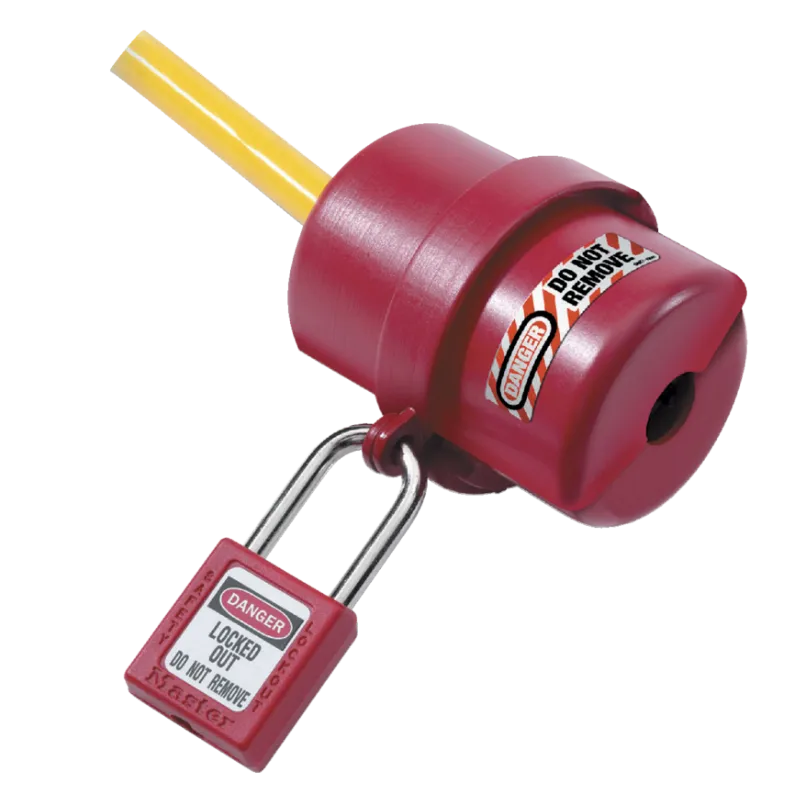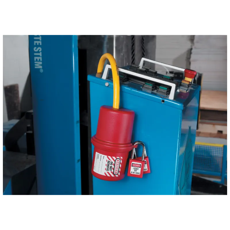 The Master Lock No. 487 Rotating Electrical Plug Lockout Device is a reliable solution to prevent accidental reconnections during maintenance or repair. Designed to enclose electrical plugs securely, it is compatible with plugs up to 2-1/4in (57mm) in diameter and 3-1/4in (82mm) in length, with cords up to 3/4in (19mm) in diameter. The patented rotating design ensures hassle-free installation in confined spaces. Crafted from durable Zenex™ Thermoplastic, this device is lightweight, chemical-resistant, and built to perform in extreme environments. High-visibility safety labels provide clear identification for added safety compliance.