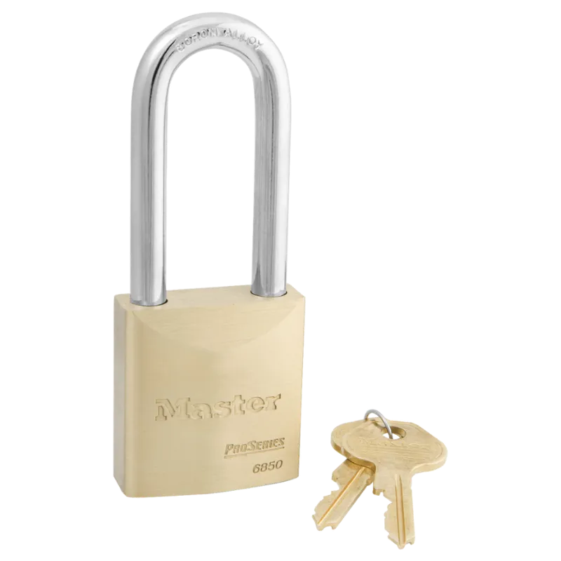 The Master Lock No. 6850LJ ProSeries® Solid Body Padlock offers industrial-grade security with its robust 2″ (51mm) wide solid brass body, engineered to resist corrosion in caustic, salty, and corrosive environments. This padlock is a durable and reliable solution for commercial and industrial security needs.