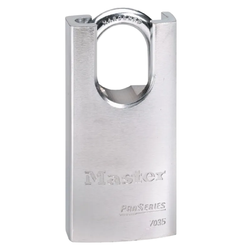 The Master Lock No. 7035 ProSeries® Shrouded Padlock delivers ultimate security for commercial and industrial applications. Its heavy hardened steel body features chrome rustproofing, ensuring durability and a long service life in challenging environments.