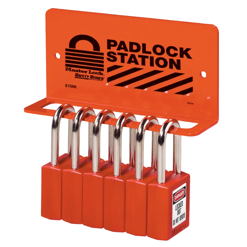 The Master Lock No. S1506 Heavy Duty Padlock Rack is an essential organizational tool for safety lockout/tagout (LOTO) procedures in industrial and manufacturing settings. Made from heavy gauge steel with a durable powder coat finish, this rack is designed to withstand the rigors of demanding environments while securely holding up to 8 safety padlocks. The included labels in multiple languages (English, Spanish/English, and French/English) ensure clear identification for a diverse workforce.