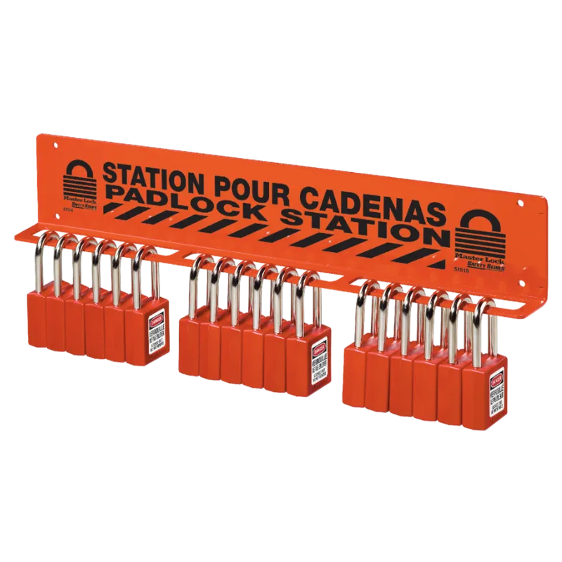 The Master Lock No. S1518 Heavy Duty Padlock Rack is an essential organizational tool for safety lockout/tagout (LOTO) procedures in industrial and manufacturing settings. Made from heavy gauge steel with a durable powder coat finish, this rack is designed to withstand the rigors of demanding environments while securely holding up to 18-22 safety padlocks. The included labels in multiple languages (English, Spanish/English, and French/English) ensure clear identification for a diverse workforce.