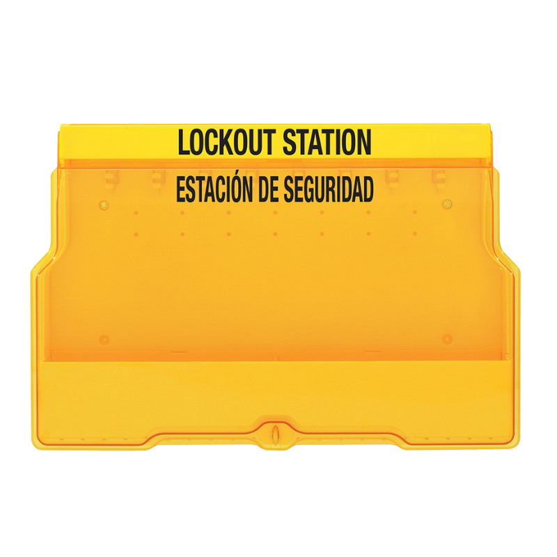 The Master Lock S1850 Wall Mounted Lockout Station is a large-capacity, unfilled station designed to organize and secure a wide range of lockout devices for departmental use. Made from resilient polycarbonate for superior heat and impact resistance, it features a translucent, lockable cover to protect contents from dust and prevent equipment loss. Its one-piece molded construction eliminates loose parts, and pre-drilled holes along the bottom allow for additional pegs or hooks to hang bulky items. Measuring 15.5″ x 23.5″ x 4.5″, the station includes trilingual labels for flexible application in English, Spanish, or French.
