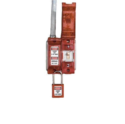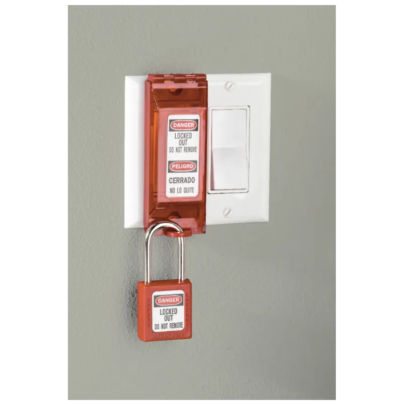 The Master Lock No. 496B Universal Wall Switch Cover is a versatile lockout device designed to secure both toggle and Decora™ paddle switches. Its patented design ensures the switch remains locked in either the on or off position, while the hinged cover allows for normal switch operation when unlocked. Ideal for maintaining safety and compliance, this device includes bilingual labels for clear identification.
